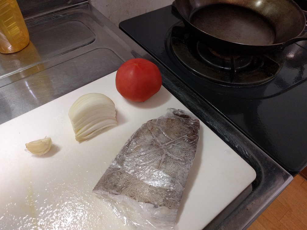 にんにく1片、たまねぎ1/4、フレッシュトマト、アオリイカの耳、鷹の爪、ホールトマト